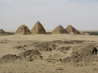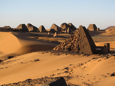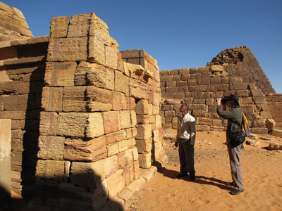 On Thursday 13th January we visited the stunning Necropolis of Meroe definitely one of the highlights of our visit to the Sudan. The cemetery is located about 3km from the Nile on a series of ridges covered with sweeping sand drifts. More than 40 pyramids are located in the North and South Cemeteries, constructed by the �black-pharaohs� of Meroe between 270 BC and 350 AD. The pyramids are 30 to 40 m high and in front of each one there is a small mortuary temple decorated with bas-reliefs that depict the King or Queen associated with the Egyptian funerary Gods like Osiris and Isis. We had great fun exploring these wonderful shrines with their distinctive raised relief decoration. In the afternoon we visited the Royal City of Meroe with its remains of the Temple of Amun, the royal �bath complex� and minor temples. We also visited the non-royal West Cemetery with its minor pyramids belonging to the nobility.