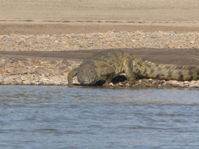 Early on the morning of the 21st January some of us walked back to Soleb. The early morning light provided a different experience highlighting the richly carved hieroglyphic inscriptions, and we were able to make out the relief figures of Amenhotep IV/Akhenaten on the front Pylon. We drove south again to the ferry stop and recrossed the Nile, having lunch in the local cafe nearby. From here we headed north, eventually arriving at the boat crossing point for the Island of Sai. We took a cruise on the river and all became much excited when we saw enormous Nile crocodiles sunning themselves on the sandbank and then striding into the river and disappearing. When we reached the island shore, the crocodiles were back on the sandbank, seemingly lying in wait for our return.