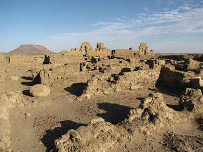 On the 15th January we left the Meroe camp and headed north by 4-wheel drive up the road which follows the Nile to the city of Atbara, where we crossed the Nile and headed across the Bayuda Desert. It was a wild dusty morning but the weather cleared as we crossed the vast open plain. We stopped for lunch near an isolated ridge of granite - the local villagers were collecting water at the well and wanted to show us their farm. In the afternoon we saw the ruined monastery of Ghazoli with its very grand church and then stopped to see the impressive sight of Jebel Barkal, an isolated sandstone massive which was sacred to the ancient Nubians. Our accommodation lay on the edge of the town of Karima near the foot of the mountain and was called the Nubian Rest-House. Developed by an Italian company, it consisted of comfortable rooms around a garden courtyard with a central lounge and dining building.